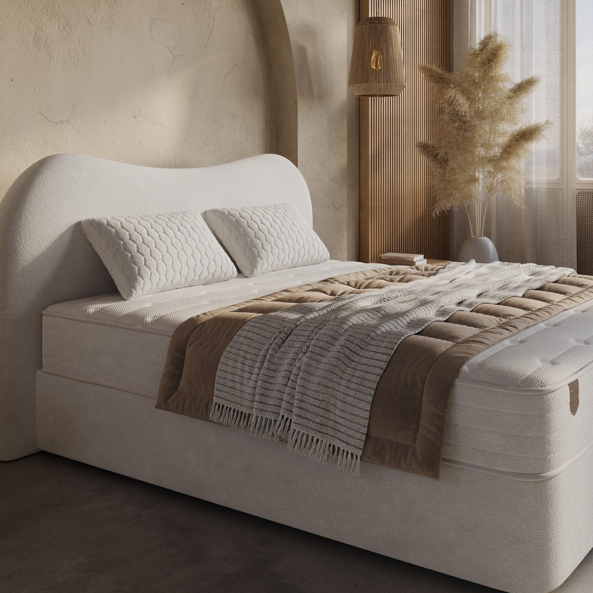De Curve boxspring is uitgerust met een geavanceerd matras en geïntegreerde topper, ontworpen voor optimaal comfort en ondersteuning.