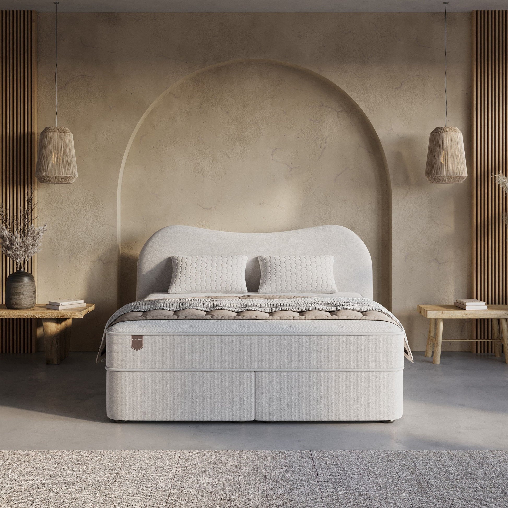 Het hoofdbord van Curve combineert strakke lijnen met een vriendelijk silhouet. De zachte teddy bouclé voegt textuur toe zonder te overheersen – minimalistisch, maar verfijnd. Dankzij het brede, gebogen ontwerp krijgt je slaapkamer een hotelwaardige uitstraling.